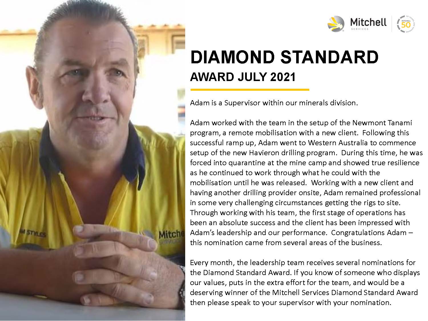 July’s Diamond Standard has been awarded to Adam Styles for his ongoing efforts with recent contract ramp ups.